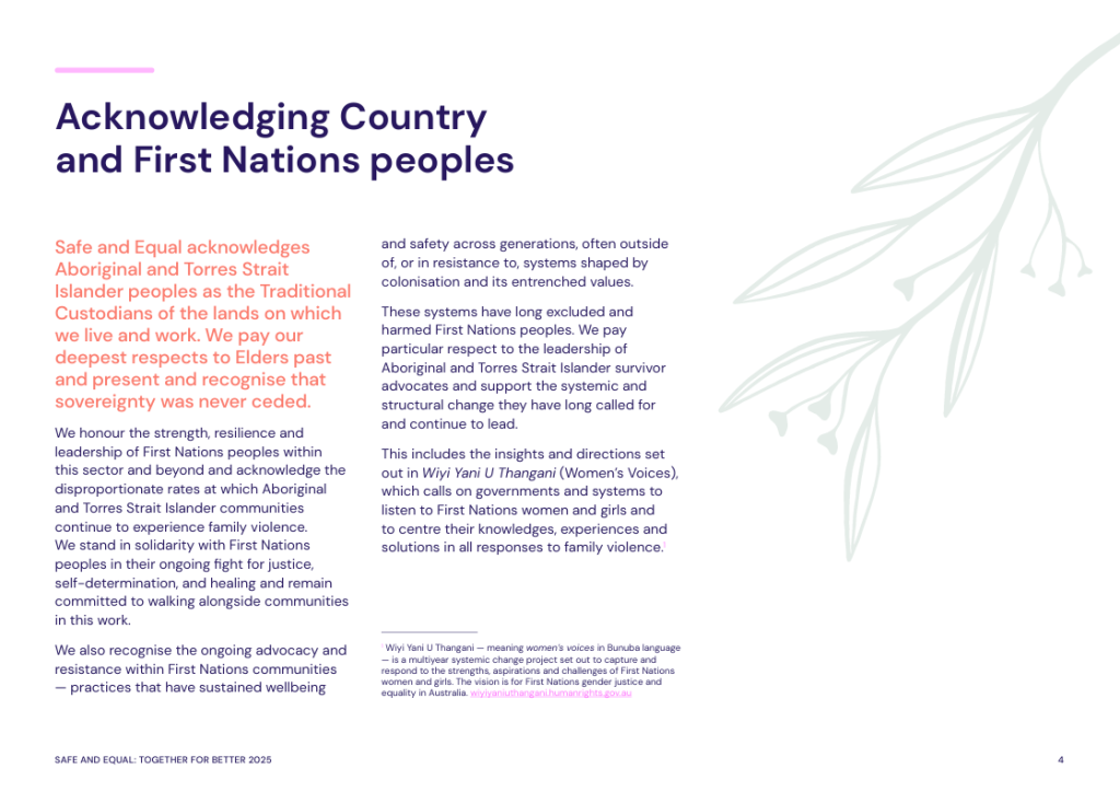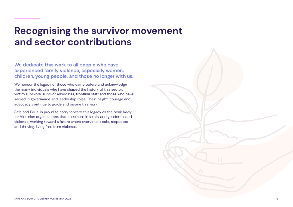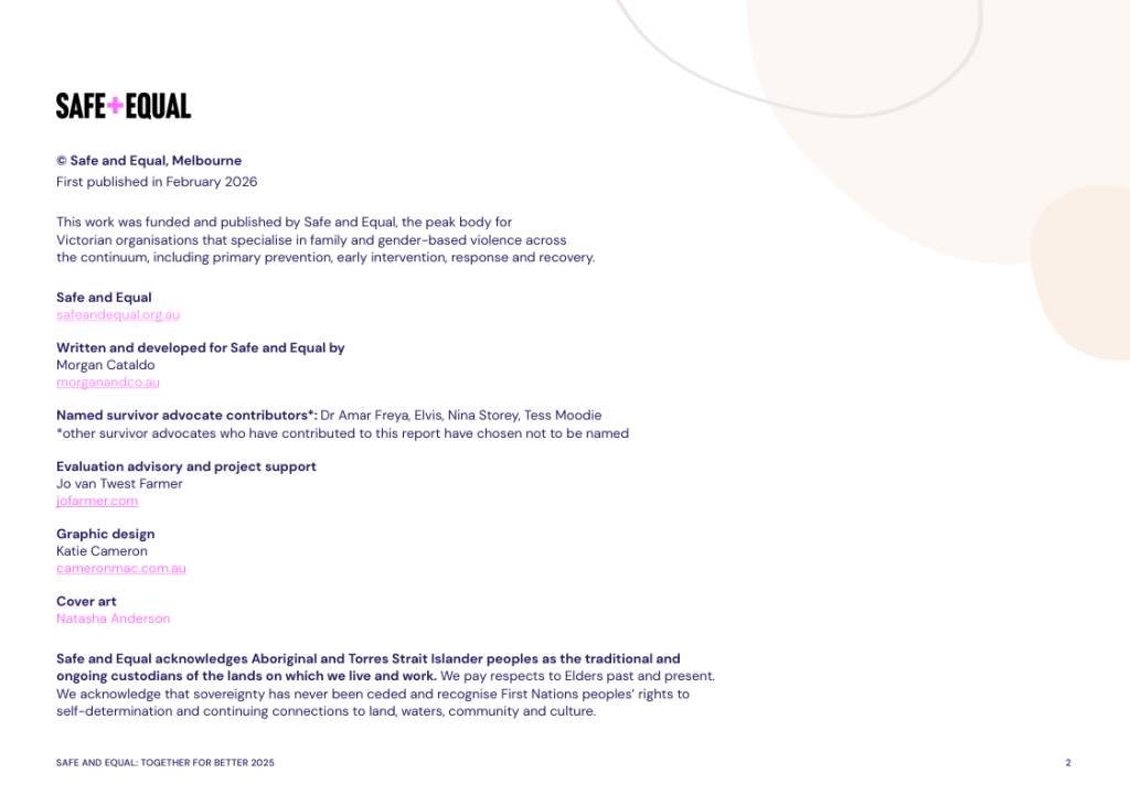 While Together for Better focuses on actionable guidance, its recommendations remain grounded in the reflections and lived expertise that informed them. The resource is offered as a contribution to collective learning across the family violence sector and beyond, supporting dialogue, reflection and practice development rather than prescribing a single way forward.