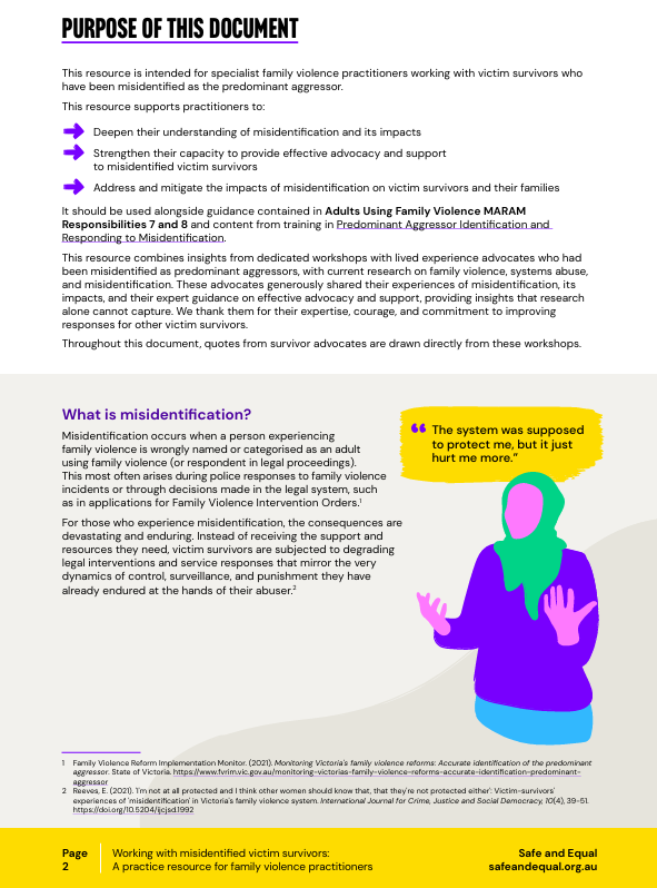 Informed by insights from lived experience advocates, this resource supports specialist family violence practitioners to strengthen their capacity to provide effective advocacy and support to misidentified victim survivors, deepen their understanding of misidentification and its impacts and address and mitigate the impacts of misidentification on victim survivors and their families.